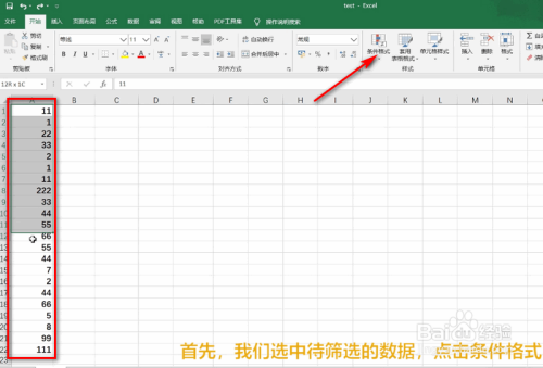1.起首,选中待筛选的数据,点击上方【前提格局】选项。