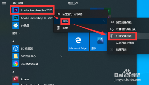 安装完当作后,在起头菜单中找到Adobe Premiere Pro 2020,右键选择【更多】-【打开文件位置】。