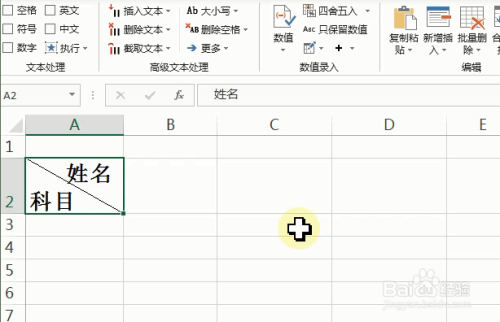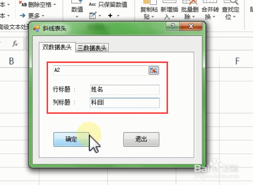【斜线表头】对话框,行题目 输入“姓名”,列题目 输入“科目”,单击【确定】