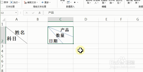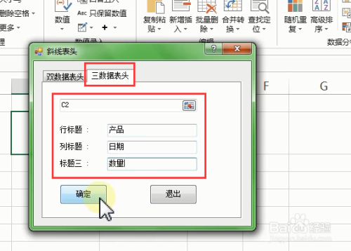 【斜线表头】对话框,单击【三数据表头】行题目 输入“产物”,列题目 输入“日期”,题目三 输入“数目”,单击【确定】