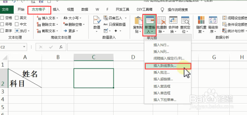 在【编纂】功能组,选择【新增插入】→【插入斜线表头】