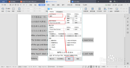 字体设置页面,设置中文字体为楷体,字号为4号,英文字体为Arial Unicode MS,字号为4,点击确定;