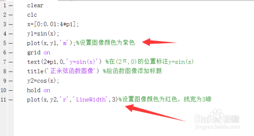 在新建剧本文件中输入下图所示程序,这里以plot函数画图为例进行讲解,plot(x,y,'color','Linewidth',2),此中color为颜色,红色是r,蓝色是b,2是线宽