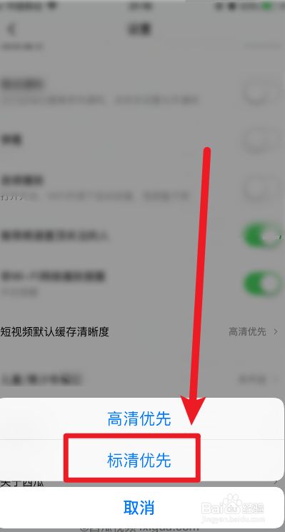 然后选择【标清优先】选项,降低西瓜视频缓存的画质,节流西瓜视频缓存的流量。