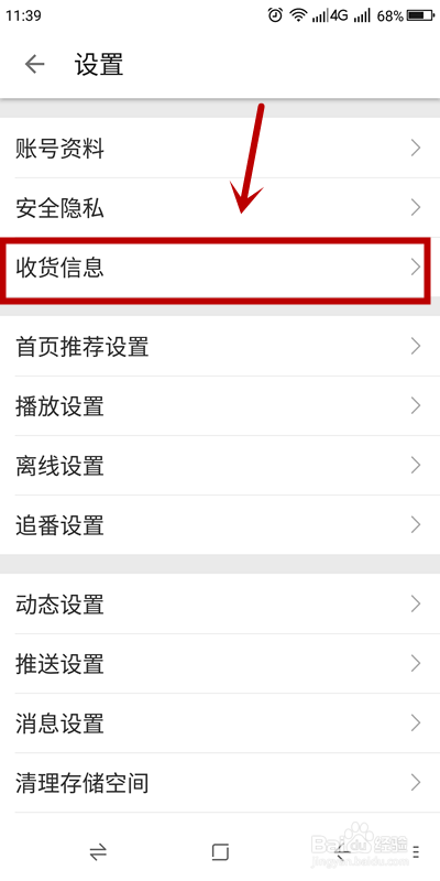 4、进入【设置】页面后,找到并单击【收货信息】选项