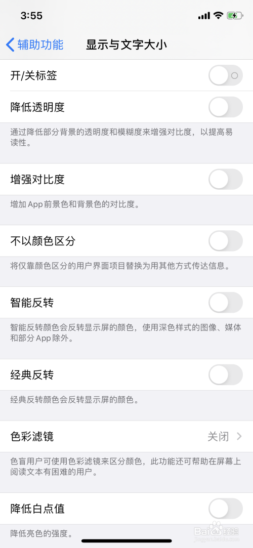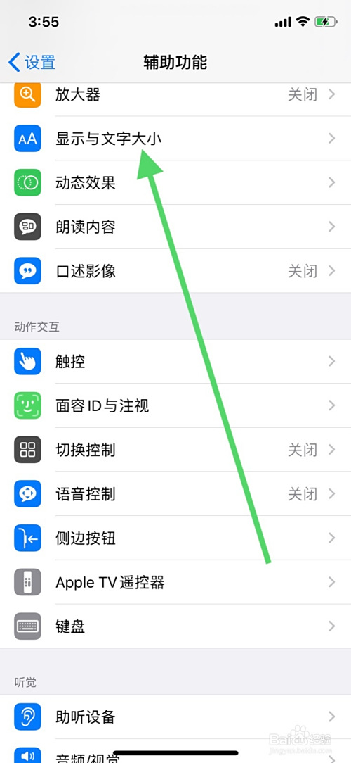 点击辅助功能页面显示与文字巨细进入。
