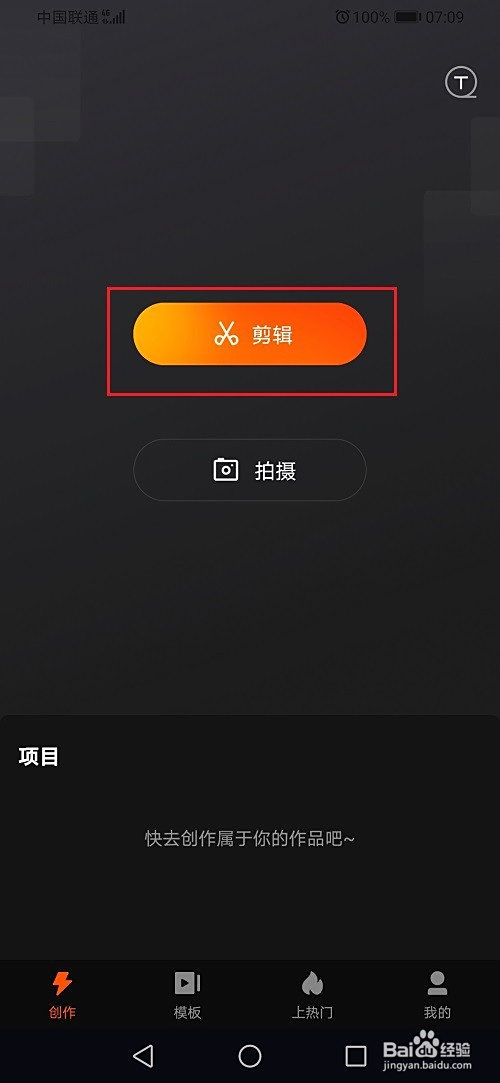第一步打开快影,进去创作,点击剪辑,如下图所示: