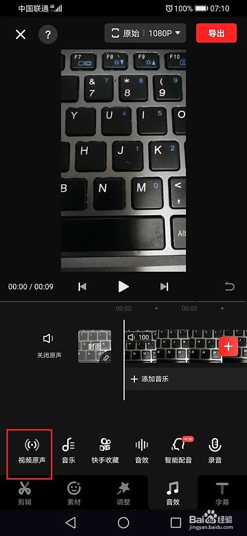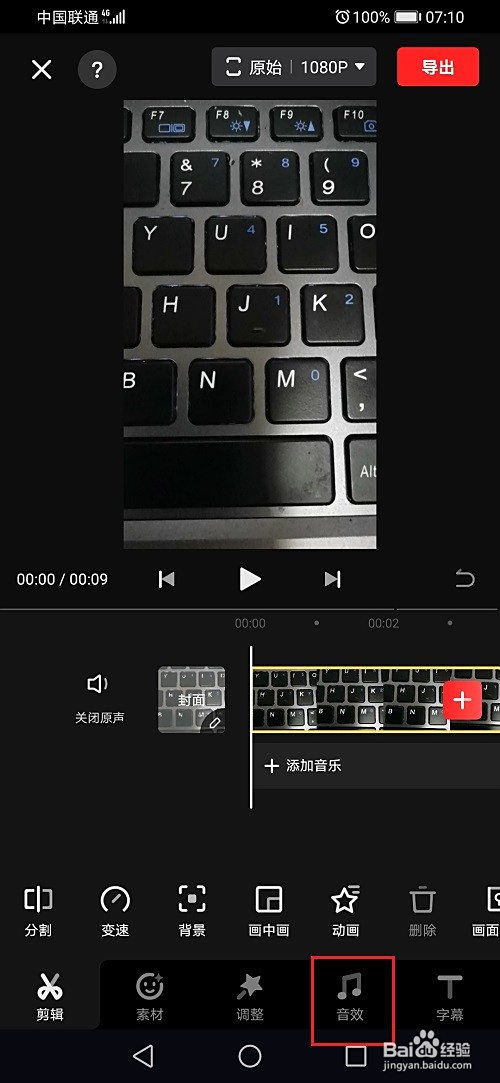 第三步进去剪辑中之后,点击音效,如下图所示: