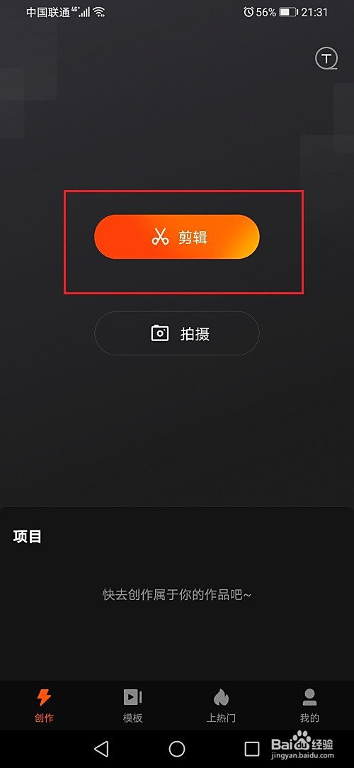 第一步手机上打开快影,进去创作界面,点击剪辑,如下图所示: