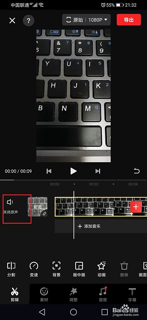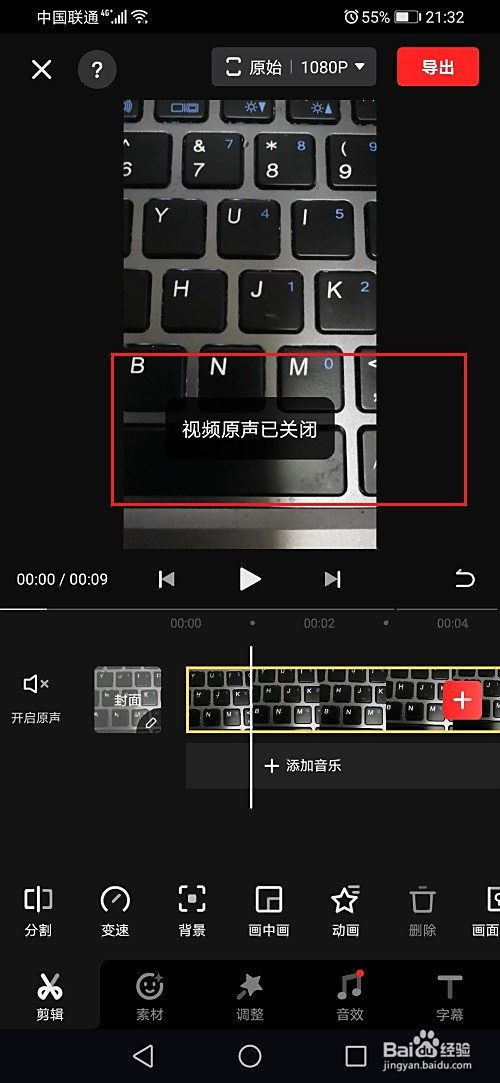第三步进去快影剪辑界面之后,点击封闭原声,如下图所示: