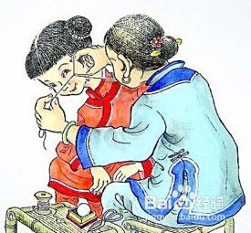 拿一条二尺多长的浸湿纱线半数,线中心在右手拇指上绕两匝,一头拿在左手上,另一头用牙咬着。