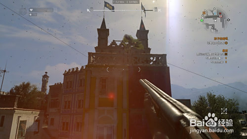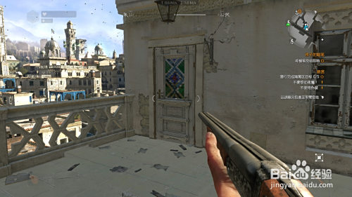 到图中位置 可以看到有两个旗子的楼 爬上屋顶 从阳台的门就可以进楼