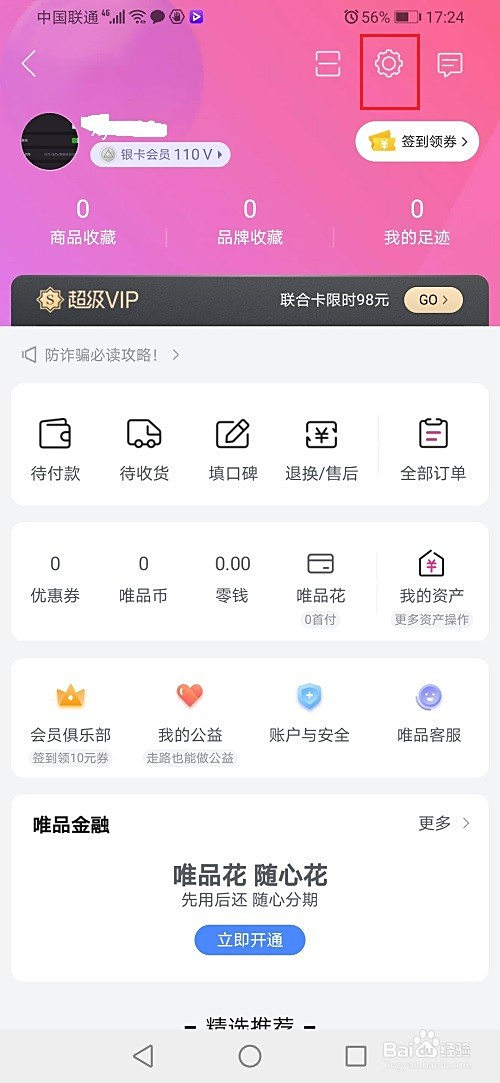 第一步打开唯品会,在小我中间,点击设置图标,如下图所示: