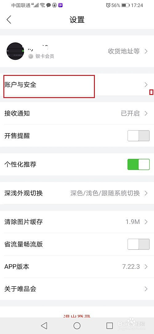 第二步进去唯品会设置之后,点击账户与平安,如下图所示:
