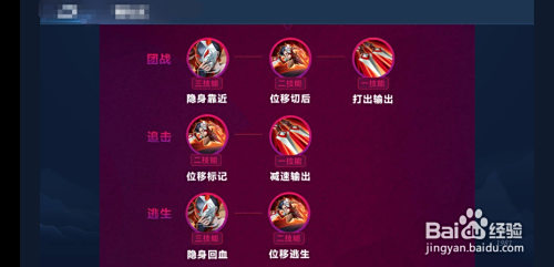 开团:三技术隐身接近,二技术位移切后排,一技术打出持续危险;