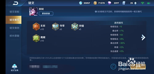 铭文搭配,无双*10,夺萃*5,打猎*5,鹰眼*10;