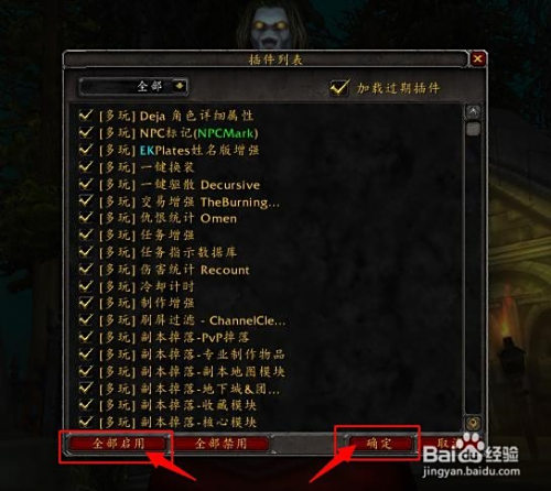 然后,选择“全数启用”,之后点击“确定”,此时进入游戏就会有插件了