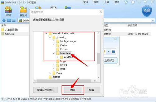 然后,找到魔兽怀旧服客户端“Interface”,将“AddOns”解压到“Interface”文件夹,点击确认即可