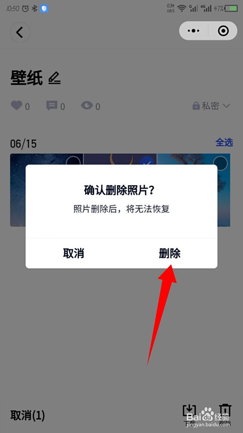 在弹出简直认删除照片窗口中,点击删除。如图所示