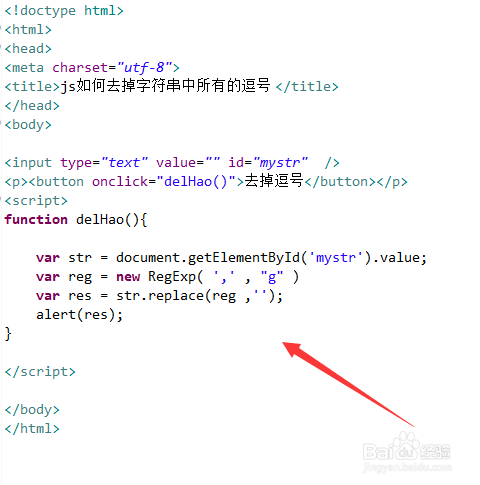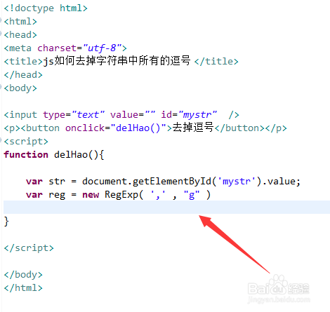 2、在js中,经由过程id获得input对象,经由过程value属性获得输入的字符串,并建立替代去失落逗号的正则表达式。