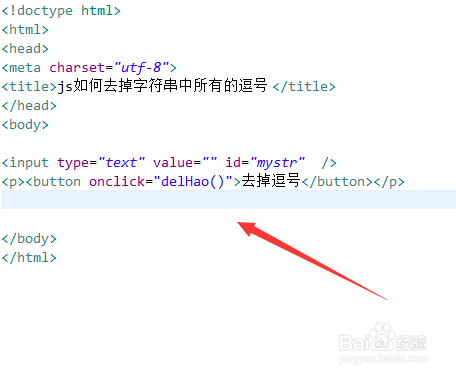在js标签内,建立delHao()函数,在函数内,经由过程id获得input对象,经由过程value属性获得输入的字符串,并建立替代去失落逗号的正则表达式。