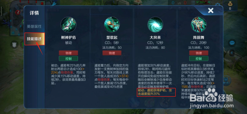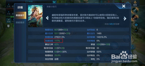 然后点击技术描述,可以看出弓手虞姬2技术的被动可以+20%的攻速。学了这个技术后就直接到攻速阈值的第三档(大于16.6%)
