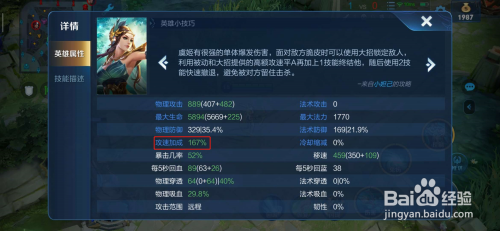 到了游戏中期,只要我们出装选择了攻速鞋(+25%攻速),(电刀+35%攻速)。品级也应该在12级以上了,也就是+33%以上攻速当作长,再加上2技术的被动+24%以上攻速(随技术品级的晋升而提醒攻速,1级+20%,满级+30%)。那么攻速加起来一个是117%以上,弓手虞姬进入到了攻速阈值的倒数第二档(大于116%)