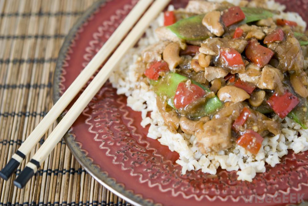 用刺激性黑豆酱调味的鸡肉炒菜。