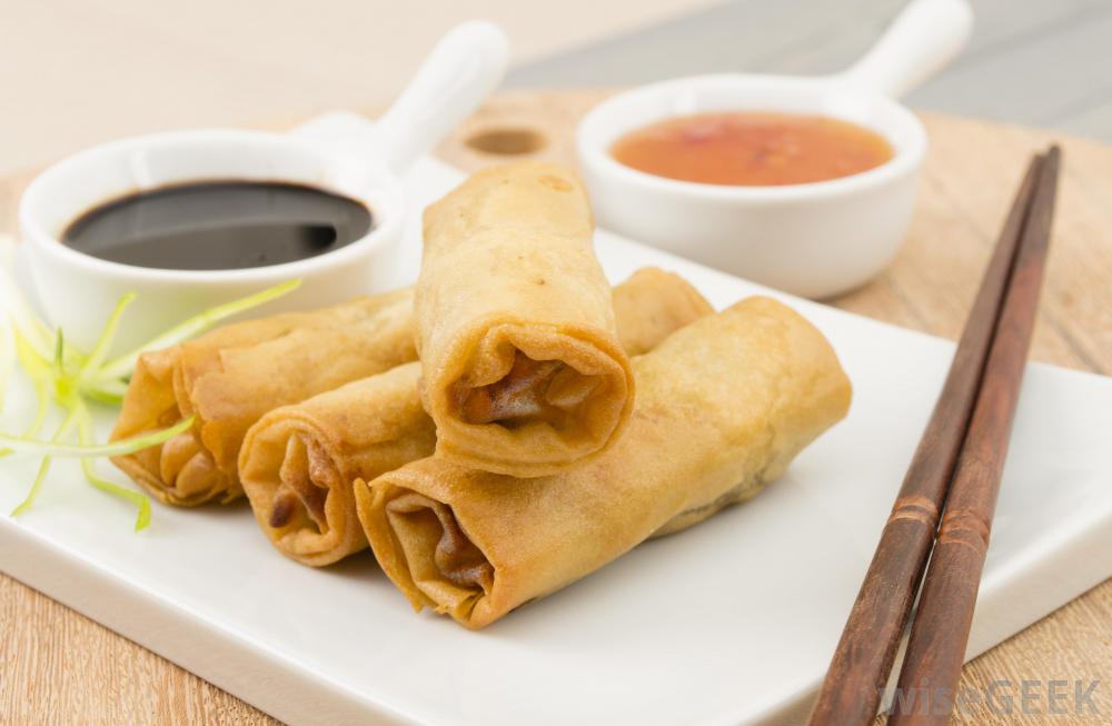玉米淀粉,中国南方的粤菜对美国的中餐影响最大,蛋卷就是一个很好的例子。粤菜通常是油炸的,蛋卷也是。在中餐馆里,蛋卷通常与组合晚餐一起供应,大的也不错午餐,还有一碗汤。