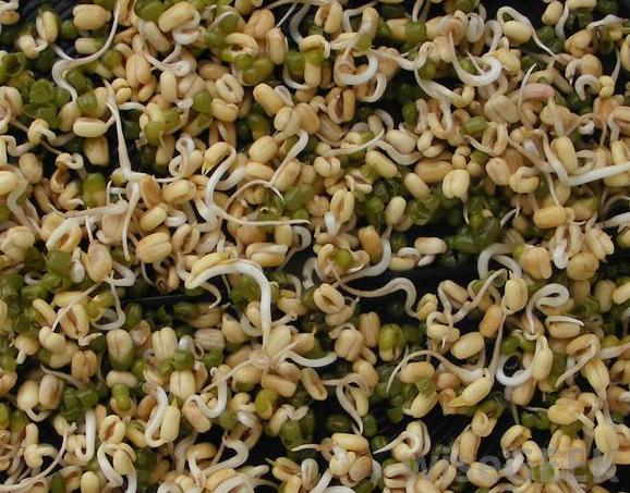 绿豆。绿豆可以在家里用最简单的设备发芽。种子首先用水冲洗,所有漂浮的或破碎的豆子都会被清除。一旦彻底清洗,这些豆子会被浸泡在室温的水里,或者至少在32华氏度(约0摄氏度)的水中浸泡8到12小时。浸泡过程软化了坚硬的种皮,让水渗透并刺激发芽。