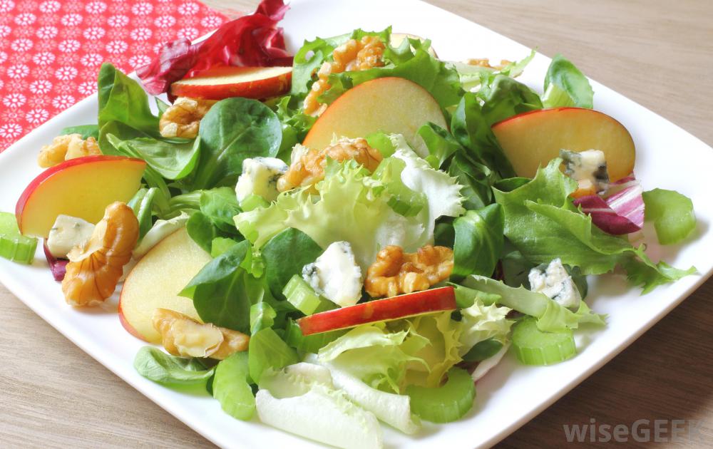 苹果沙拉是一种最简单的制作方法,它将切片或切碎的苹果与沙拉蔬菜(如菠菜)混合在一起。这种搭配可以与清淡的调味料一起搅拌,也可以与烤杏仁、松仁和碎奶酪混合。与苹果绿色沙拉搭配的其他配料包括胡萝卜、核桃和干果等作为葡萄干。加入鸡肉、火鸡或金枪鱼做成更美味的沙拉。