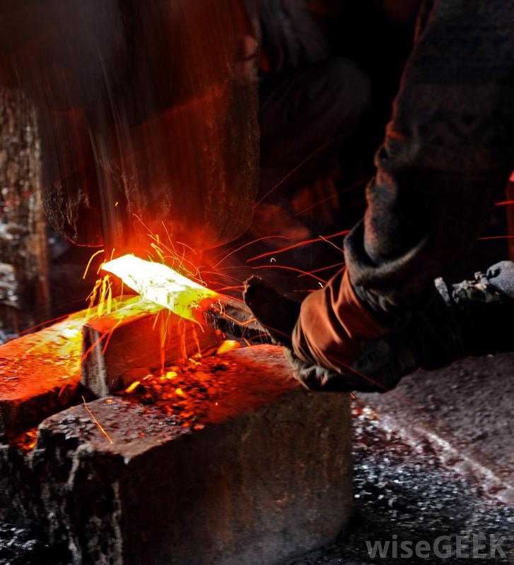 铁匠艺术的真正例子,即使是大规模的。钢坯,或一块钢,在锻炉中加热。然后用锤子把钢锤击成刀的粗糙形状。再加热,接着进行更多的锤击。几个加热循环,冷却和锤击都是为了回火钢,使刀变得结实而不易折断。
