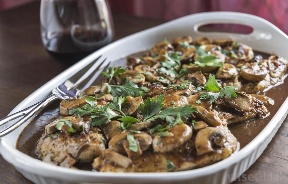 用葡萄酒、蘑菇和新鲜百里香煨制的马萨拉鸡肉。