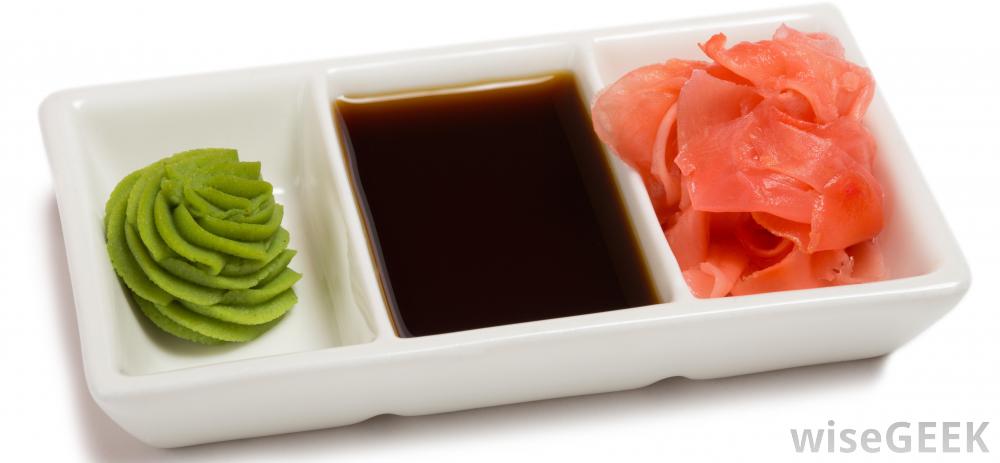 有些寿司盘子上有调味品的隔间,比如芥末和酱油。
