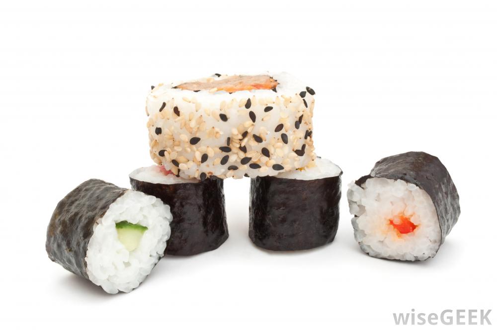 传统寿司由生鱼片(如金枪鱼、鲑鱼和鲷鱼)放在粘乎乎乎的日本米饭上。这些寿司可能被称为"nori"的干海藻纸包围,也可能不被它包围。这些寿司又分为两种类型:有芥末的寿司和没有芥末的寿司。芥末是一种辛辣的寿司一些日本人认为辣根酱可以杀死生鱼中的虫卵。寿司也可以在寿司里加上nori,然后卷成寿司卷。