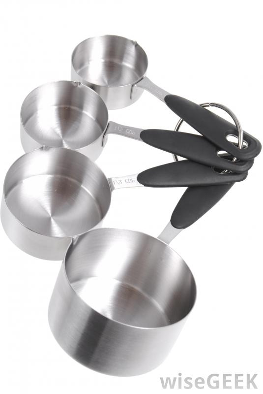 为了大量测量干配料,使用量杯是必要的。量杯用于测量干配料时,应具有均匀的边缘,而不是喷嘴,因为带喷嘴的量杯是用来测量液体的。量杯和量勺测量时应遵循相同的程序。多余的成分应刮去使用同一制造商的小刀和量杯来完成配方。