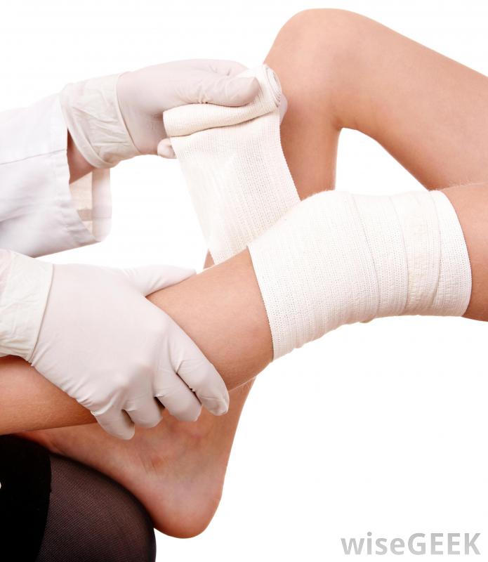 弹性绷带通常用于包扎拉伤和扭伤,以帮助减少肿胀和限制活动。这些绷带通常紧紧地包裹在受伤的附件上,绷带的边缘重叠。另一方面,卷起的纱布可以用来止血,并防止微生物和碎屑进入开放性伤口。在开放性伤口周围包扎绷带时,也应使用纱布垫,并且绷带应在伤口两侧各包几英寸(7.6厘米),这些绷带都不能包得太紧,因为这会导致血液循环问题。