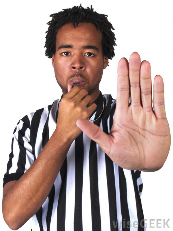篮球裁判可能会鸣哨表示违反规定游戏规则哨子和秒表是篮球裁判员必备的设备。裁判员用哨子向球员、计时员、记分员和其他裁判员发出停止或开始比赛的信号。篮球裁判员会在秒表上记录正式比赛时钟和射门时钟,以防记分板时钟出现故障