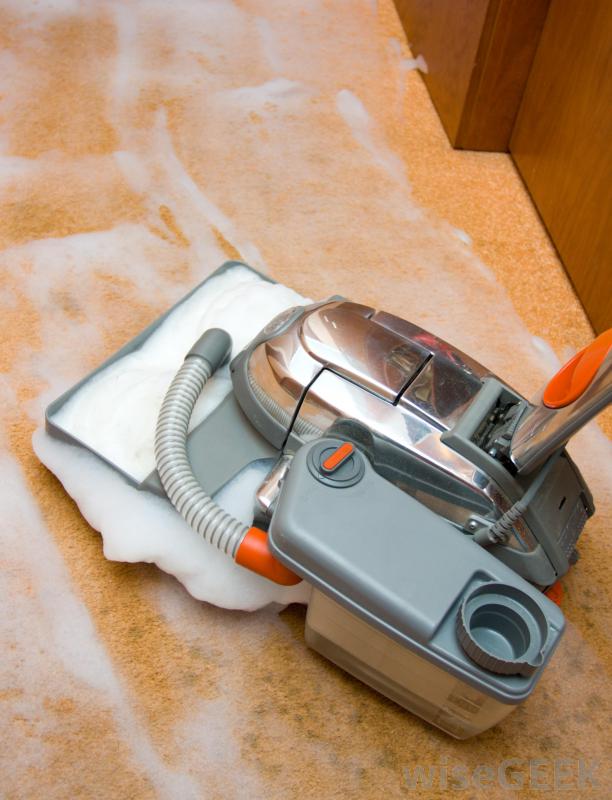 一个人用蒸汽清洁地毯。蒸汽清洁器的工作原理是将水加热到水变成蒸汽蒸汽膨胀,并通过喷嘴喷出,喷嘴可直射到需要清洁的表面。当蒸汽冷却并变成水时,它将污物从材料中抽出,并从表面脱落。许多蒸汽清洁器将脏水吸回单独的腔室中,而另一些则要求用户擦拭被清洁的表面,以除去水滴和污垢。
