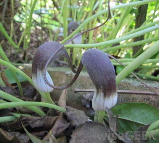 Arisarum vulgare,通常被称为arison,或者像Arisarum simoverinum一样,修士的斗篷。这种植物有一个深紫色或几乎黑色的佛焰苞,覆盖着白色或米白色的黑桃。这种植物生长在阴凉和阳光下,但喜欢持续潮湿,排水良好的土壤。原产于地中海地区。