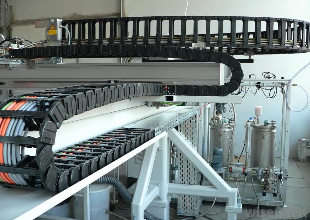 有些传送带是由塑料制成的。板链式输送机系统的特点是坚固的皮带,类似于坦克的履带。这种皮带由重叠的金属板制成,由于其固有的强度和刚性,它可以承载非常重的负载,金属表面。公司在输送机必须在极端环境条件下运行的区域使用这种类型的传送带系统。这种传送带可以在非常高和非常低的温度下工作,而这些温度可能会破坏传统材料制成的传送带,像橡胶和织物一样。在食品工业中,有时用塑料板代替金属板。