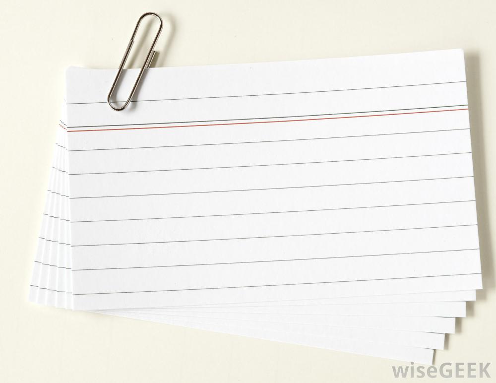 笔记卡可以用来写一份聚会或活动所需的物品清单。对于学生、教师和其他许多人来说,笔记卡或索引卡是有用的组织工具。当人们进行研究时,他们可以在索引卡上写下引文和来源。或者,有些人使用索引卡是为了给他们的演讲或演讲做笔记。他们也可以被转换成学习乘法之类的东西的闪存卡,这些卡片对于幼儿园以上的学生来说是很有用的。索引卡可能是完全空白的或是有线条的,索引卡的大小也不尽相同。