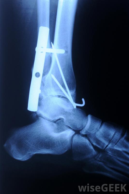 更复杂的跟骨骨折需要手术切开足部,暴露骨折,然后用销钉和钢板固定。