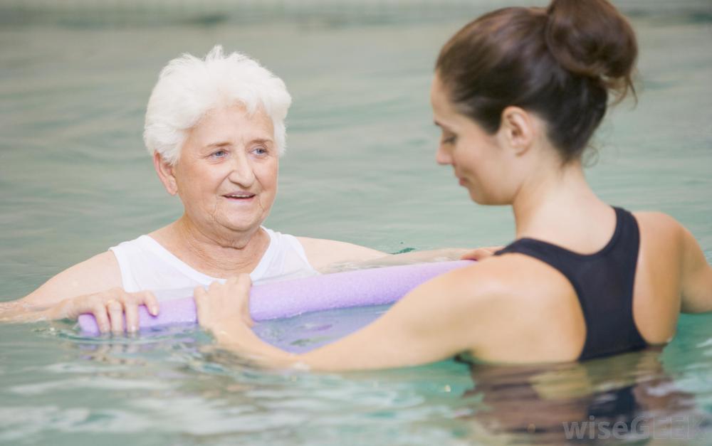 水上疗法是在水中进行康复训练,它对关节和骨骼的压力很小。大多数水上疗法训练课的开始和结束都是在浅水区边缘进行肌肉拉伸提供平衡支撑的游泳池。课程通常在浅水区进行有氧运动或舞蹈类运动,在此期间,可以增加手腕和脚踝的重量,以增加健身难度,并更好地根据参与者的能力进行训练一些典型的动作包括向前和向后走、跑、蹲和站、跳起和跳起。协调的手臂动作通常由教练演示以增加难度和增加身体素质,但根据参与者的健康水平是可选的。为了使参与者的心率保持在有针对性地,更剧烈的有氧运动可与固定的水上治疗练习相混合,如向前或侧向抬腿或提膝。
