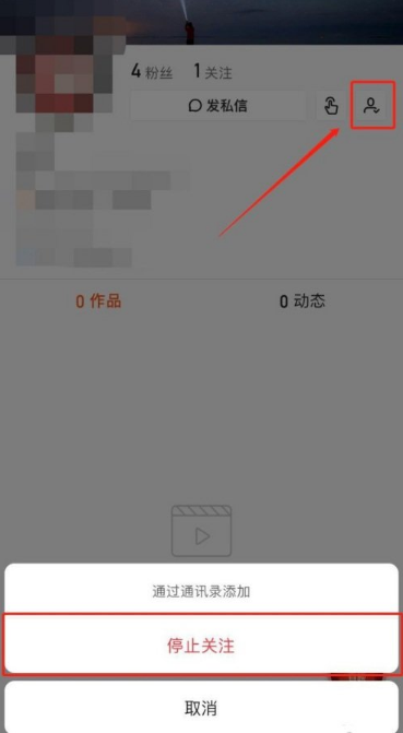 五、进入主页之后,在“发私信”后面有两个图标,点击后面一个带勾的小图标,出现弹框,选择“停止关注”,现无批量取消关注功能,将所要取消的关注的好友一个个取消就可以了。