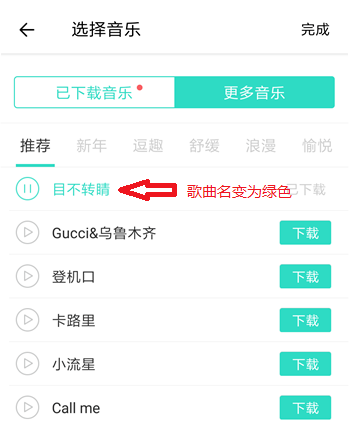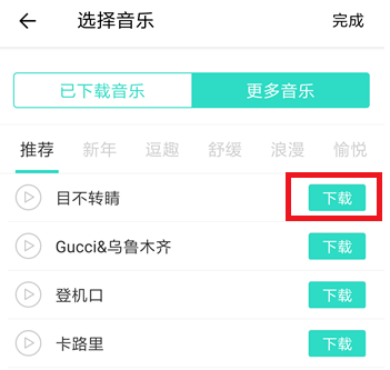 接下来会进入到配乐界面,找到自己喜欢的音乐并点击后方的【下载】。