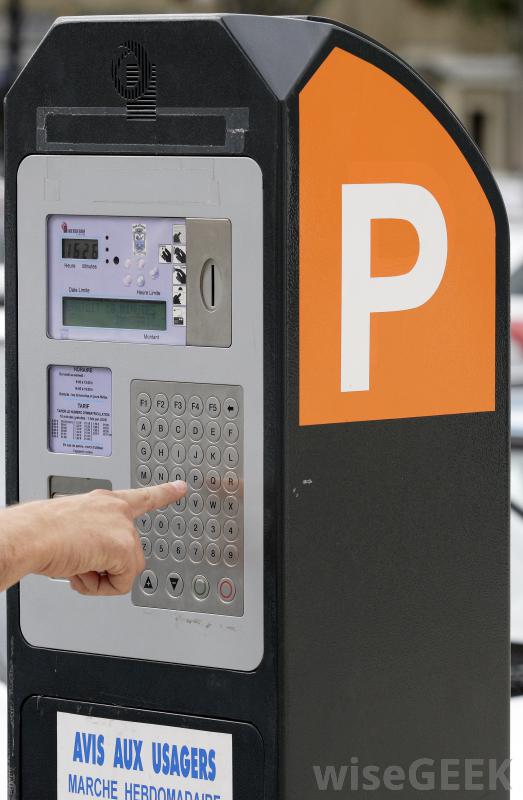 停车场执法人员可以在停车收费表上阅读和收钱。