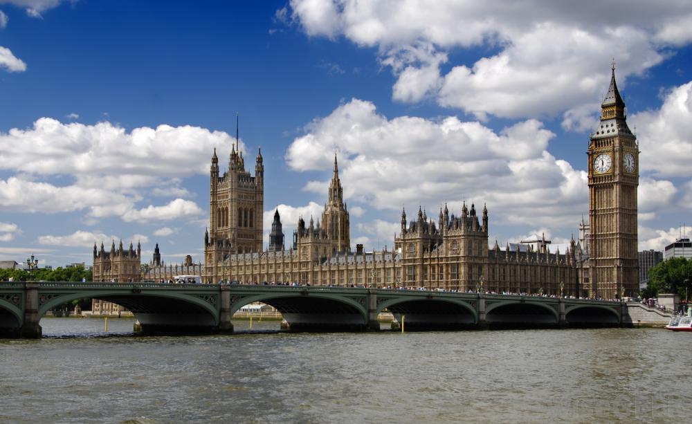 英国议会在威斯敏斯特宫开会,由上议院和下议院组成。